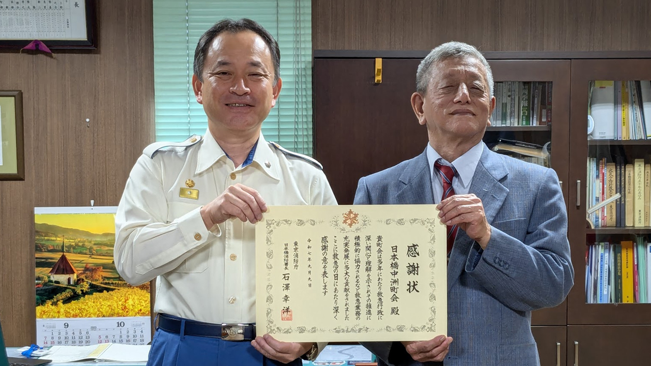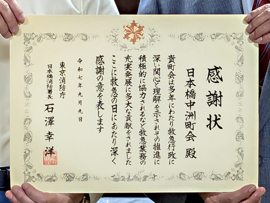 令和7年9月25日、日本橋消防署にて、中洲町会が東京消防庁より感謝状をいただきました。