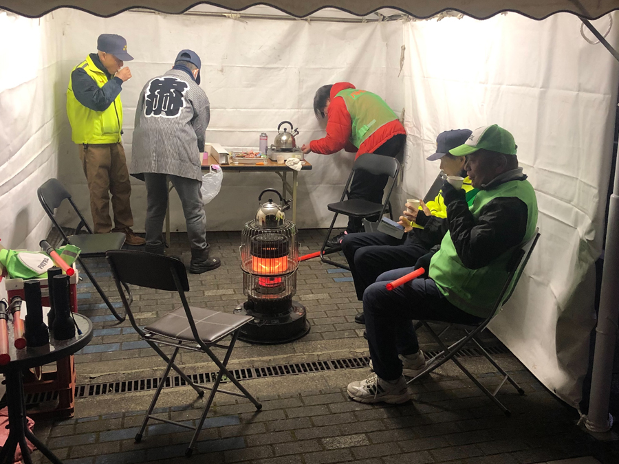 12月26日には、日本橋消防署浜町出張所の所長が幕舎周辺までお越しくださり、特別警戒の様子をご覧いただきました。